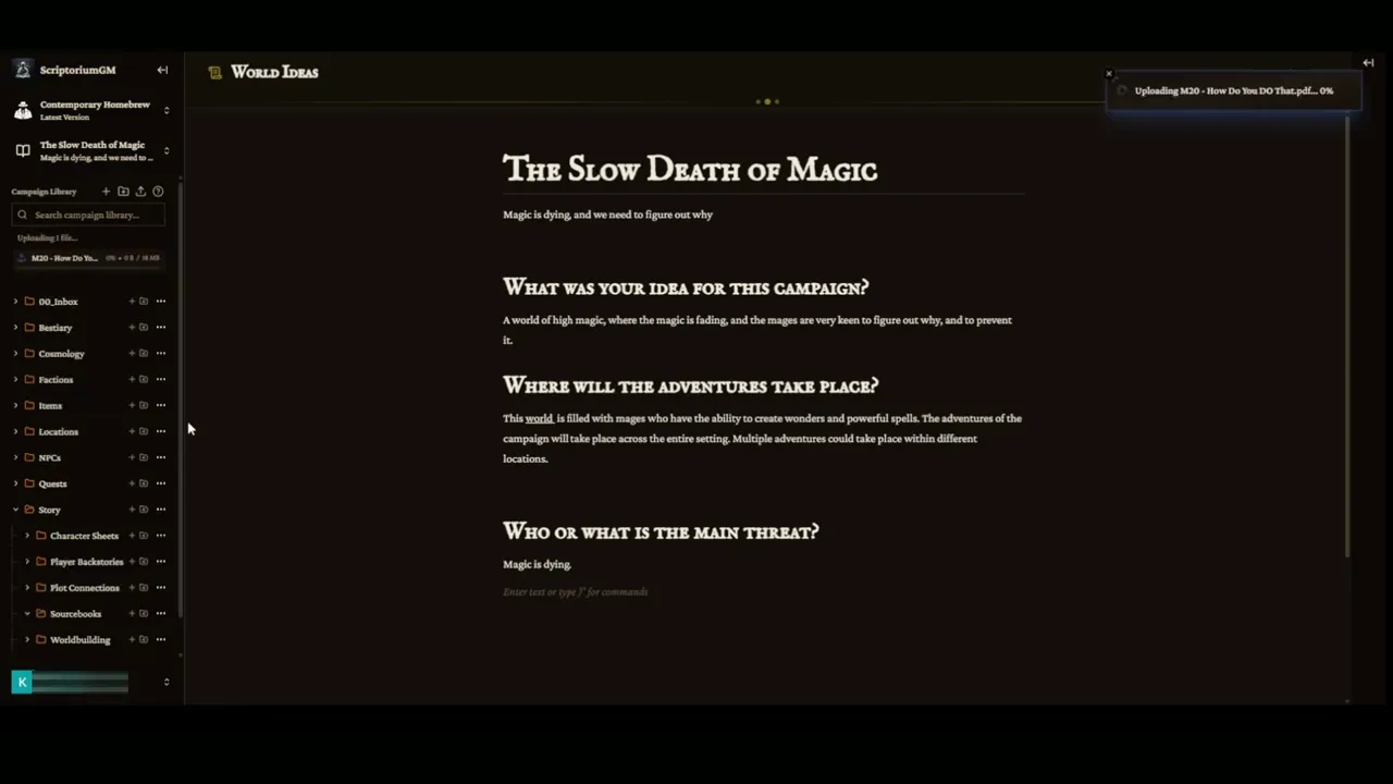 First, I set up a folder structure inside ScriptoriumGM for The Slow Death of Magic. Nothing fancy. Just the bones of an organization system that won't collapse the moment the campaign gets more complex than a single page of notes.